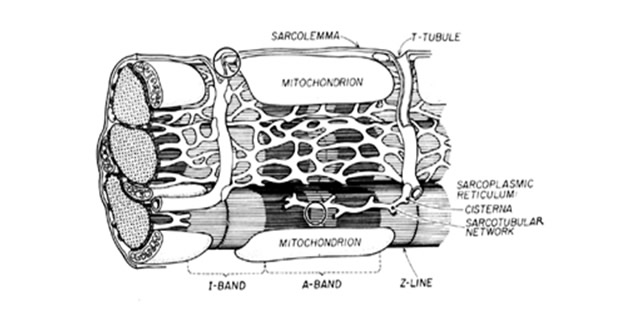 Sa strana T tubula se nalaze cisteren sarkoplazmatskog retikuluma, koje su bogate jonima kalcija. Ovaj kompleks 1 tubul i 2 cisterne se naziva trijada. Svako mišićno vlakno sadrži nekoliko stotina do nekoliko hiljada miofibrila. Svaka miofibrila ima oko 1.500 miozinskih i 3000 aktinskih filamenata koji leže jedni uz druge, a u njihovu građu ulaze kontraktilni proteini aktin i miozin. Niti miozina se jednim dijelom preklapaju i tako uzrokuju naizmjenično svijetle i tamne pruge miofibrila.