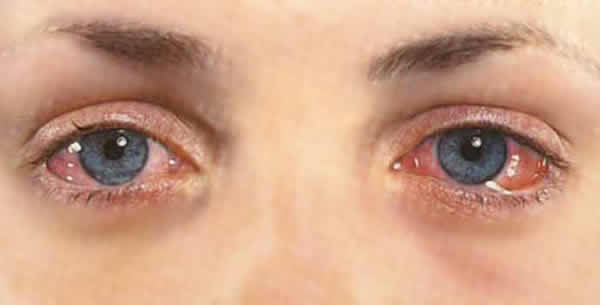 Bolesnik se žali na žuljanje, pečenje, osjećaj stranog tijela, uz prisustvo podražajnih simptoma (fotofobije, blefarospazma i epifore), a zbog obilne sekrecije oboljeli vidi kao kroz maglu.