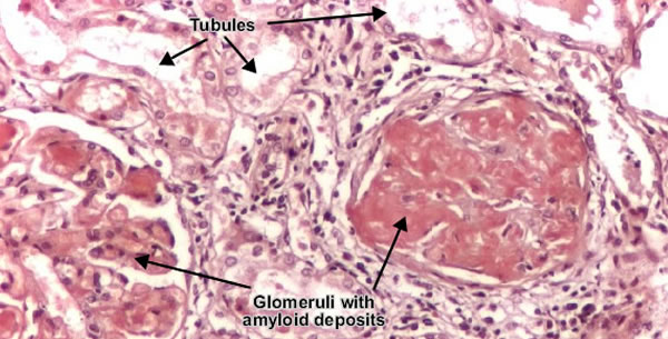 Amiloidoza Bubrega: amiloid se taloži u kapilare glomerula, intersticij i u bazalnu membranu epitelnih ćelija bubrežnih tubula. Amiloid u glomerulu dovodi do almbuminurije i lipurije, a na kraju cijeli glomerul bude uništen i njegovo mjesto zauzme amiloid homogene strukture na mikroskopu. Iz toga slijedi insuficijencija bubrega, a bolesnik umire od uremije. Makroskopski se na prerezu bubreg vidi kao uvećan, žućkast sa prozračnim prugrama u kori.