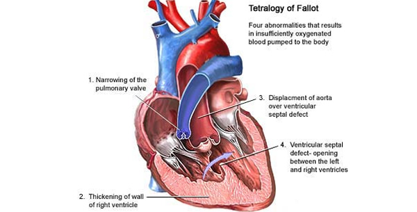 Djeca se fizički slabije razvijaju. Cijanoza je veoma prisutna. Ponekad nema cijanoze u prvim danima i mjesecima već se javlja kasnije, kada se zatvori ductus arterisus. Kod jače cijanotičnih bolesnika postoji i dispnea i pri najmanjem naporu. Čuče pri saturaciji O2 – 50%.