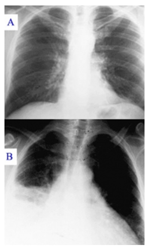 Pneumonične promjene (atipična pneumonija) su najčešća pojava kod hospitaliziranih bolesnika i javljaju se u 60%. Plućne promjene se razvijaju u obliku netipične pneumonije sa diskrepancom između diskretnog auskultatornog nalaza i sasvim jasnog radiografskog nalaza. Radiografski nalaz nakon nekoliko dana pokazuje nejasno ograničenu, meku sjenu, često multiplu ili obostranu, a prije svega u donjim plućnim režnjevima. Često se vide i natečeni hilusi. Plućne promjene se mogu podijeliti u 4 grupe: